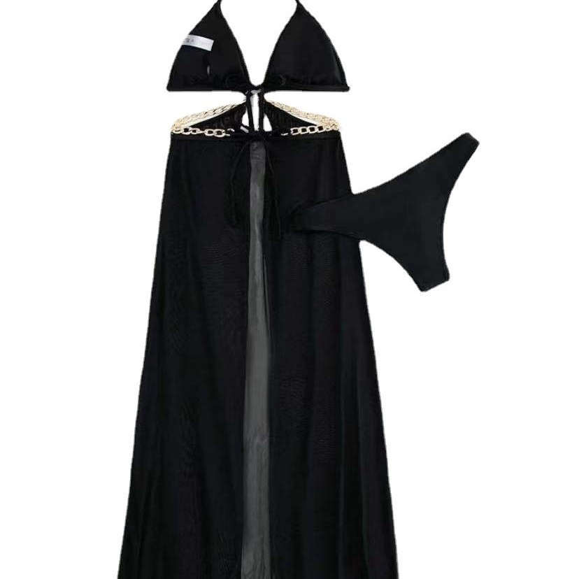 A stylish gold chain accentuates the waist, adding a chic and luxurious feel.